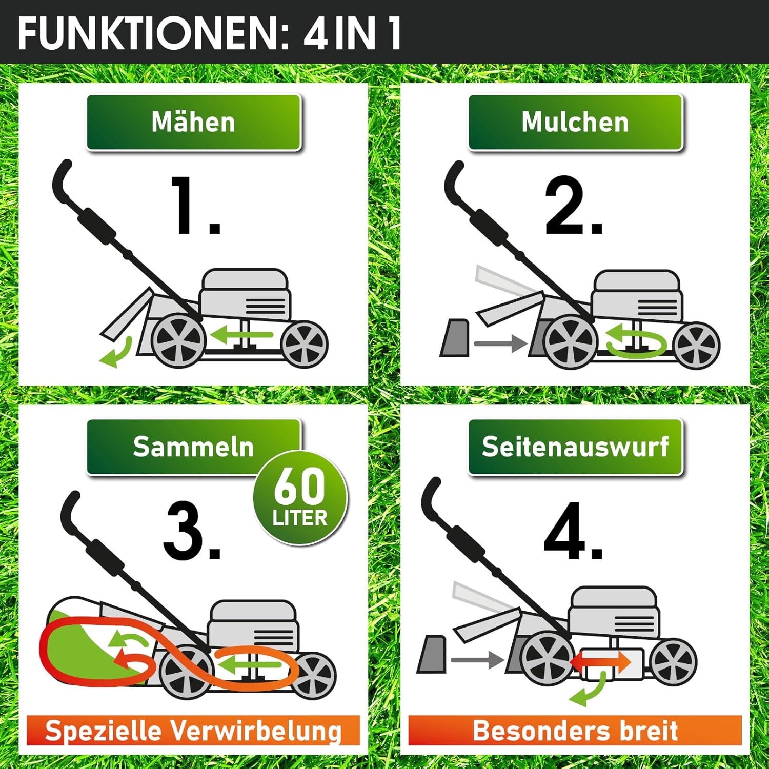 - 𝐓𝐨𝐩 𝐐𝐮𝐚𝐥𝐢𝐭ä𝐭: Der 4 Takt Rasenmäher mit Stahlgehäuse bietet Mähen, Sammeln, Mulchen und einen extra breiten Seitenauswurf für besseren Abtransport. Der große 60 Liter Grasfangsack mit Füllstandsanzeige spart durch seine hohe Kapazität häufiges Entleeren und sorgt für flüssiges Arbeiten. Die Schnitthöhe lässt sich 6-stufig zwischen 30-80mm einstellen, gleichzeitig wird das Gras dank der 2-Lagen-Konstruktion durch Verwirbelung besonders dicht und effizient im Fangkorb gesammelt