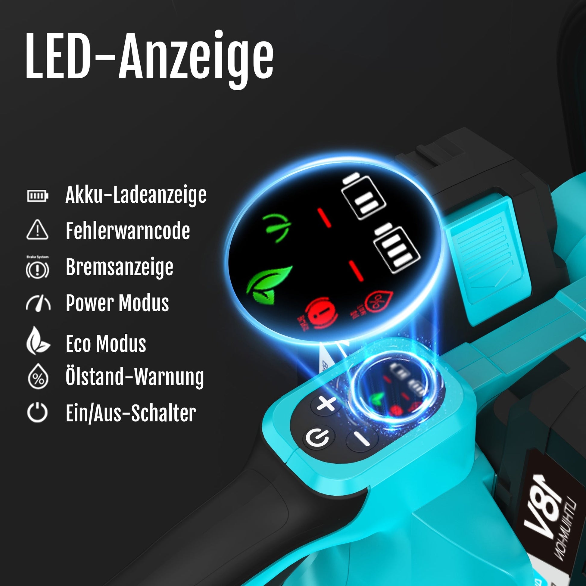 - 【Intelligentes LED-Display】Die 16-Zoll-Akku Kettensäge ist mit einem verbesserten LED-Digitaldisplay am oberen Griff ausgestattet. Es zeigt den aktuellen Akkustand, den Geschwindigkeitsmodus, die Ölstandswarnung und weitere wichtige Informationen in Echtzeit an, sodass Sie den Zustand der Maschine jederzeit im Blick haben. Zwei Geschwindigkeitsmodi – ECO (15 m/s) und POWER (20 m/s) – stehen zur Verfügung. Sie können je nach Anforderung flexibel zwischen den Modi wechseln, um eine effiziente Energienutzung zu erzielen.